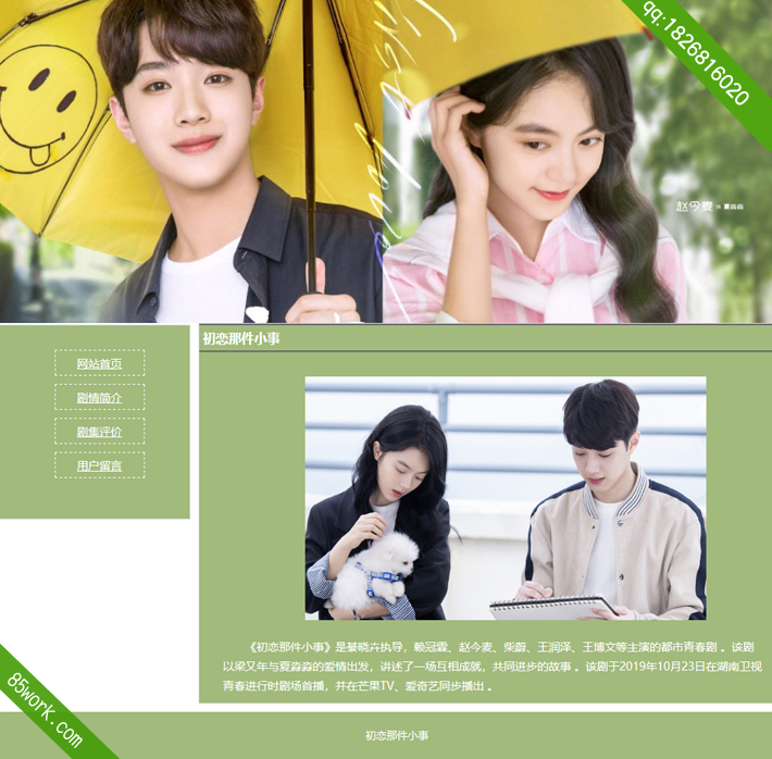 初恋那件小事网页设计作业成品由四个页面组成,分别为网站首页,剧情简介,剧集评价,以及用户留言页面,网页采用了2层结构,在首页的头部使用的是一张初恋那件小事的大海报壁纸,右侧是网站的 导航链接,初恋那件小事使用了绿色调衬托出清新初恋的氛围。网页整体比较简单,适合期末网页设计作业的初学者,同学们可以用该网页修改成其他主题的网页作业。