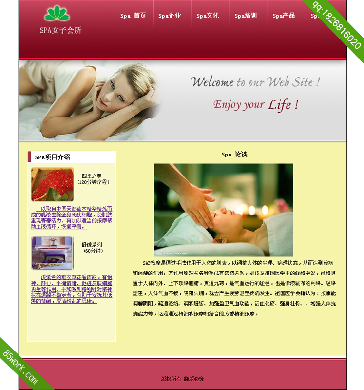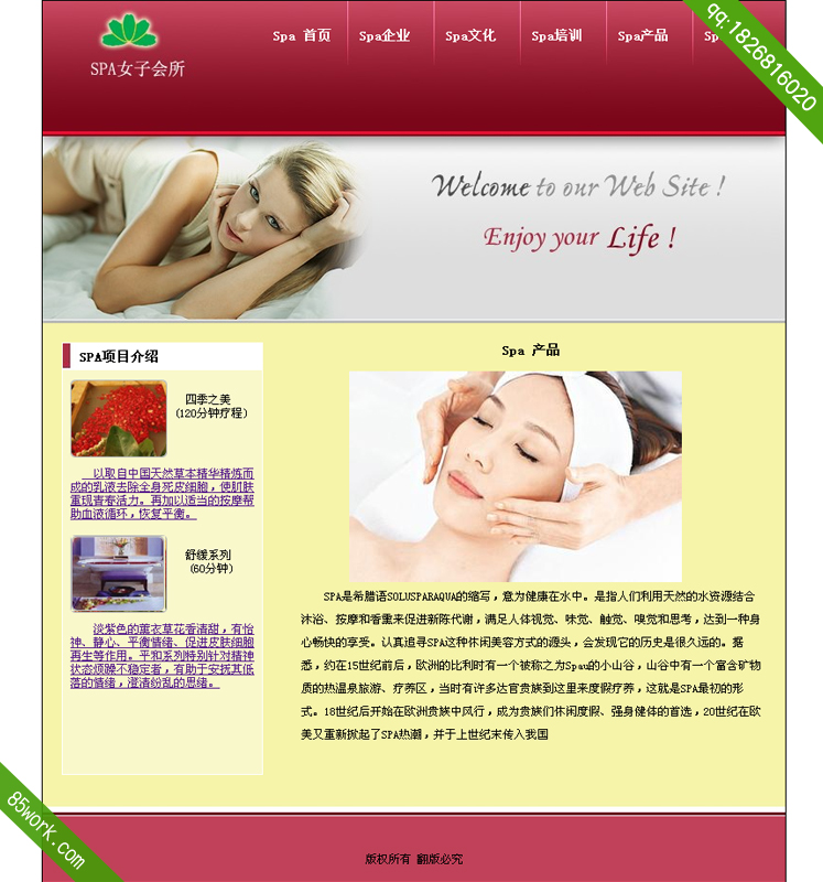 模板说明: 女子spa网页设计html作业 一共有6个页面,采用的是div+css技术,网页内容比较简易比较适合中等水平的网页设计作业学生