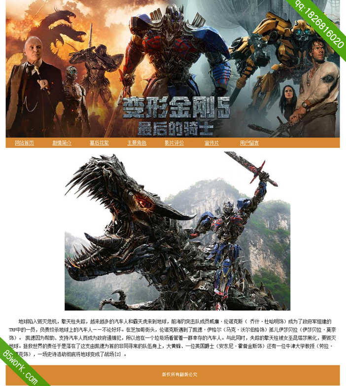 模板说明: 以电影变形金刚为主题,用dreamweaver制作静态html大学生网页设计作业,应用div css布局,一共7个网页,网页中插入图文、超链接、网络视频、表单等网页元素,适合大学生交作业使用。