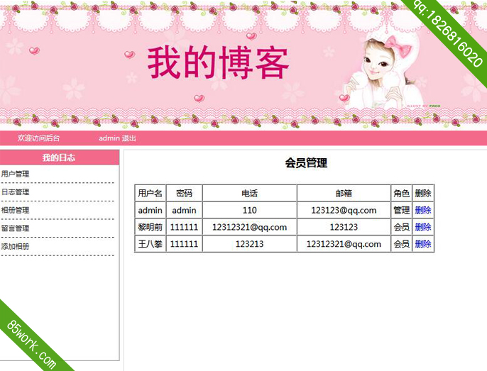 模板说明: JSP女生博客动态网站作业前台使用了div+css技术,在设计风格上使用了粉红色,比较适合女生,在JSP博客动态网站作业后台使用了JSP技术,使用MYSQL作为数据库用来存储网站所需要的数据信息,网站使用SERVLET技术,是用了面向对象语言JAVA,网站整体比较简单适合